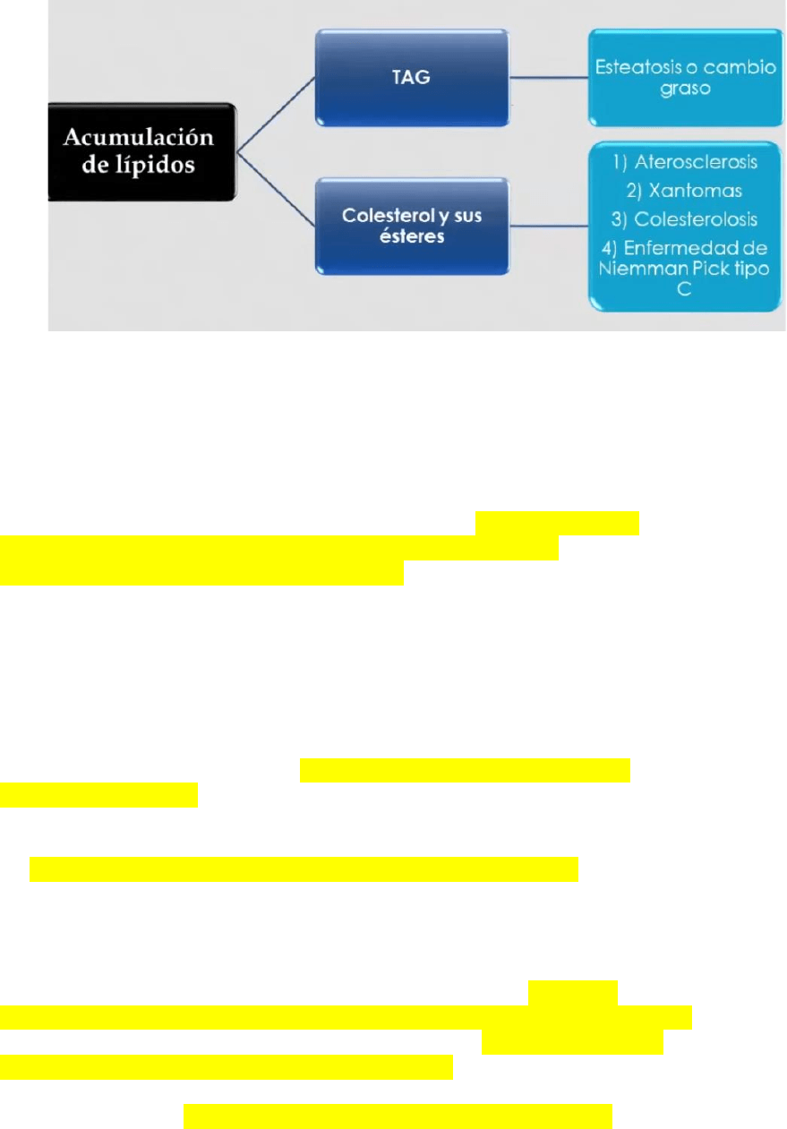 En las células pueden acumularse triglicéridos (lo más frecuente), colesterol