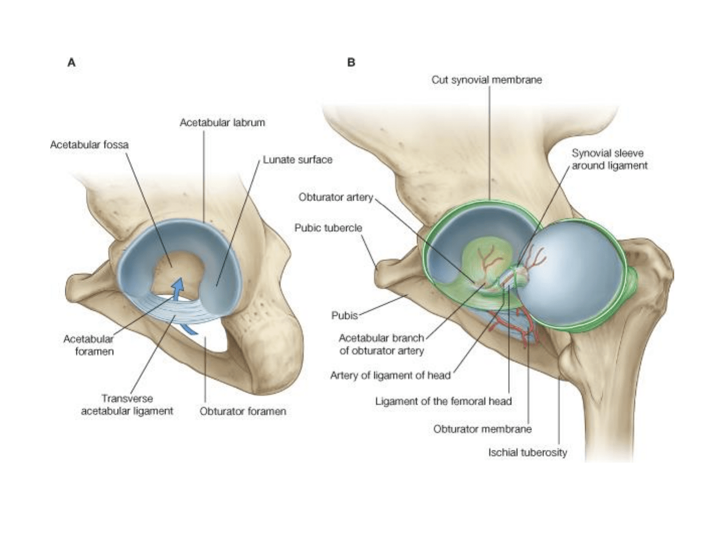 extiende entre el isquion posteroinferior al acetábulo hasta la