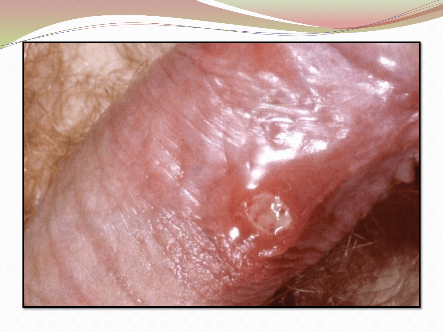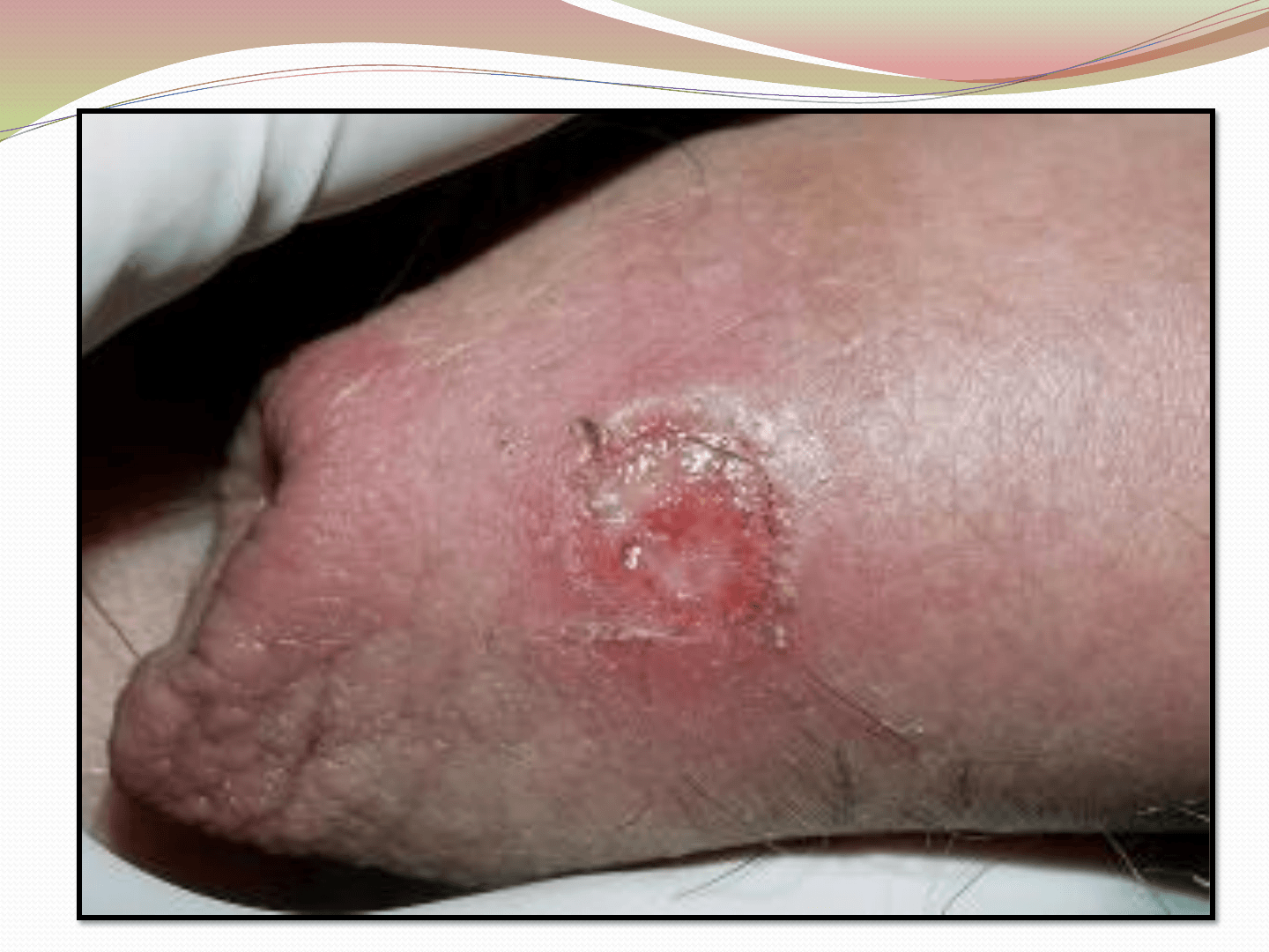 color rojo brillante con secreción mucosa y bordes indurados. Cura
