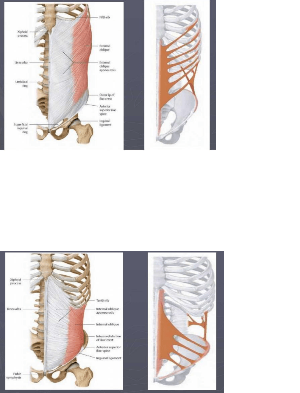 1- Musculo oblicuo externo: sus fibras descienden desde arriba hacia abajo y de lateral a medial. Se inserta en las 7 – 8 ultimas costillas,