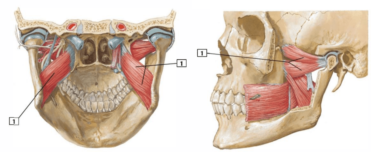 (Ambos se dirigen hacia abajo, adelante y afuera pasando entre ambos M. Pterigoideos)