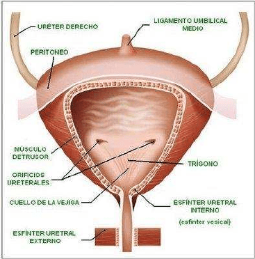 entra el orine procedente de los riñones, y la uretra que sirve para vaciar la vejiga al exterior. La zona lisa