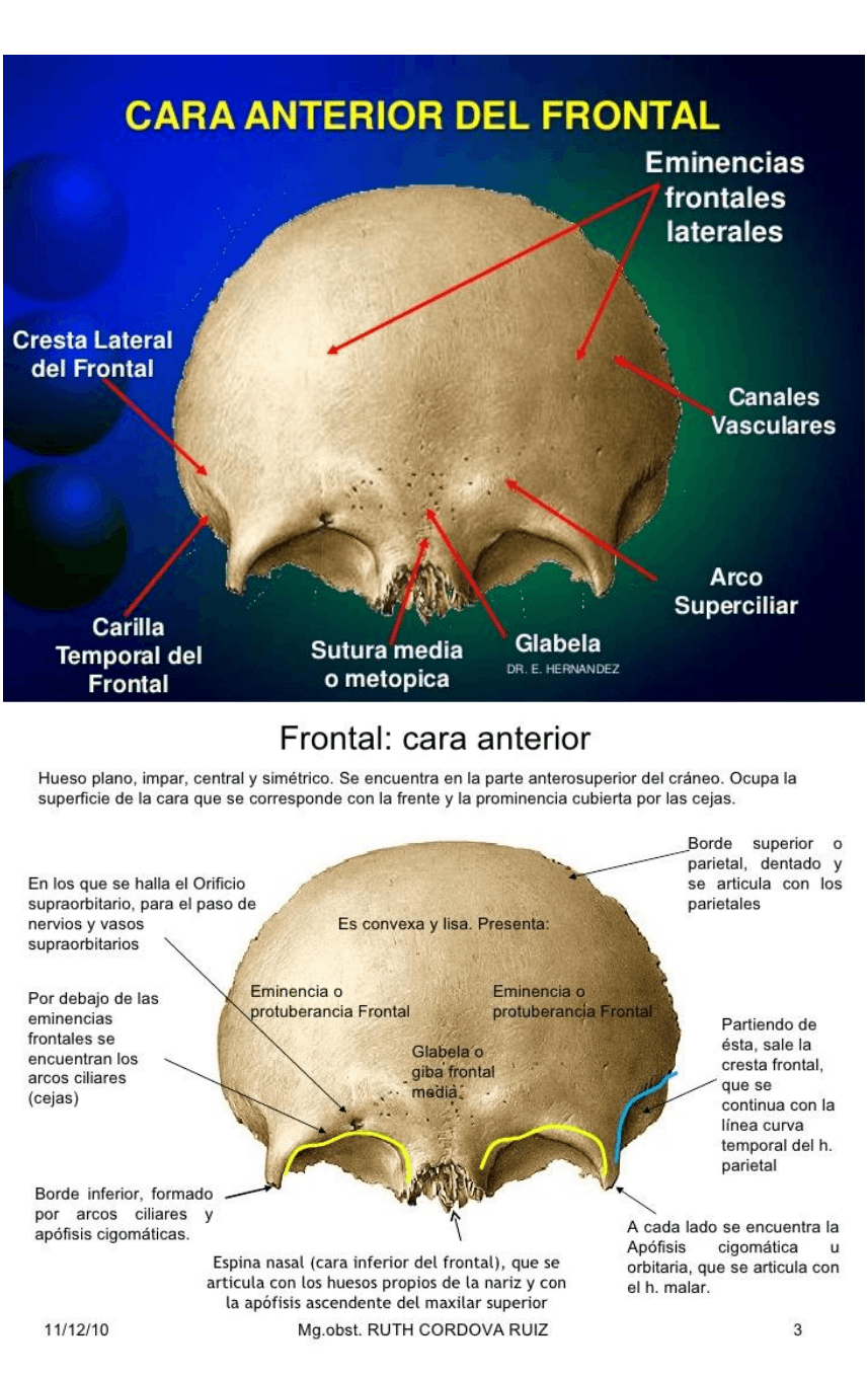 observa una eminencia llamada giba frontal media o glabela (Eminencia ósea situada en