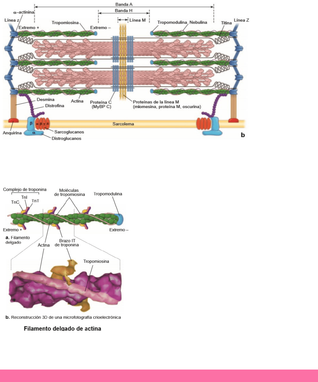 las moléculas de titina a los filamentos gruesos. Incluyen la miomesina, proteína M, oscurina y una creatina fosfatasa muscular