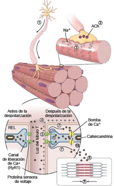 los sitios de unión a miosina en las moléculas de actina. Después de la estimulación nerviosa, se libera Ca2+ en el sarcoplasma, que se