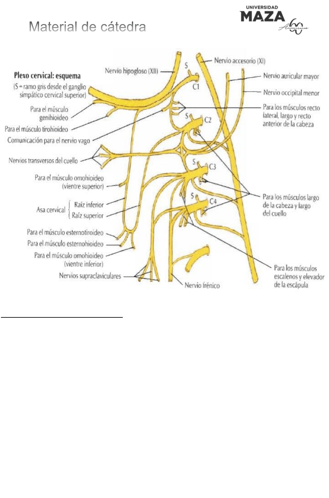 Además, el plexo cervical posee anastomosis con el nervio accesorio, el nervio hipogloso y el tronco