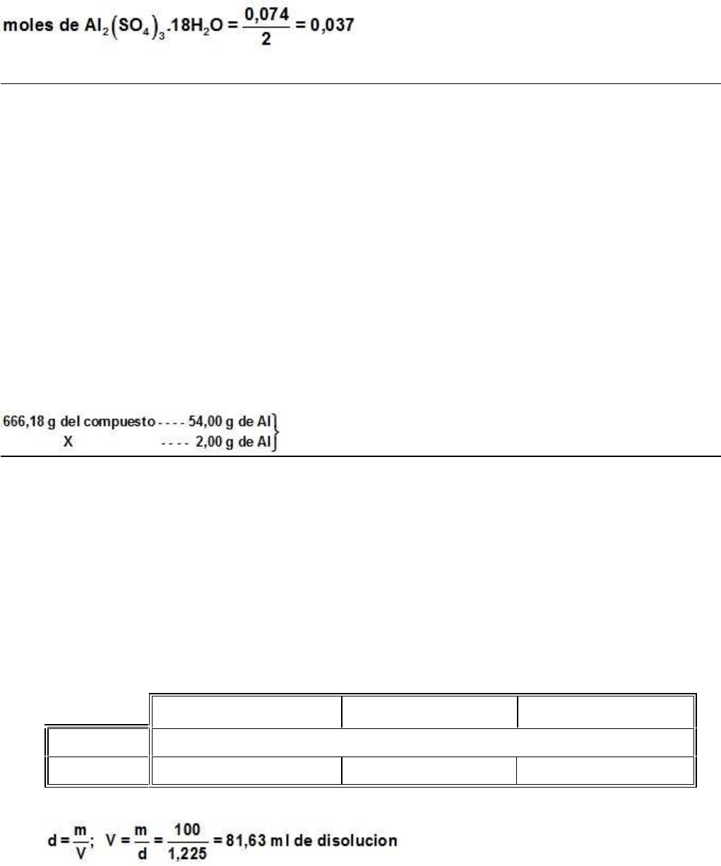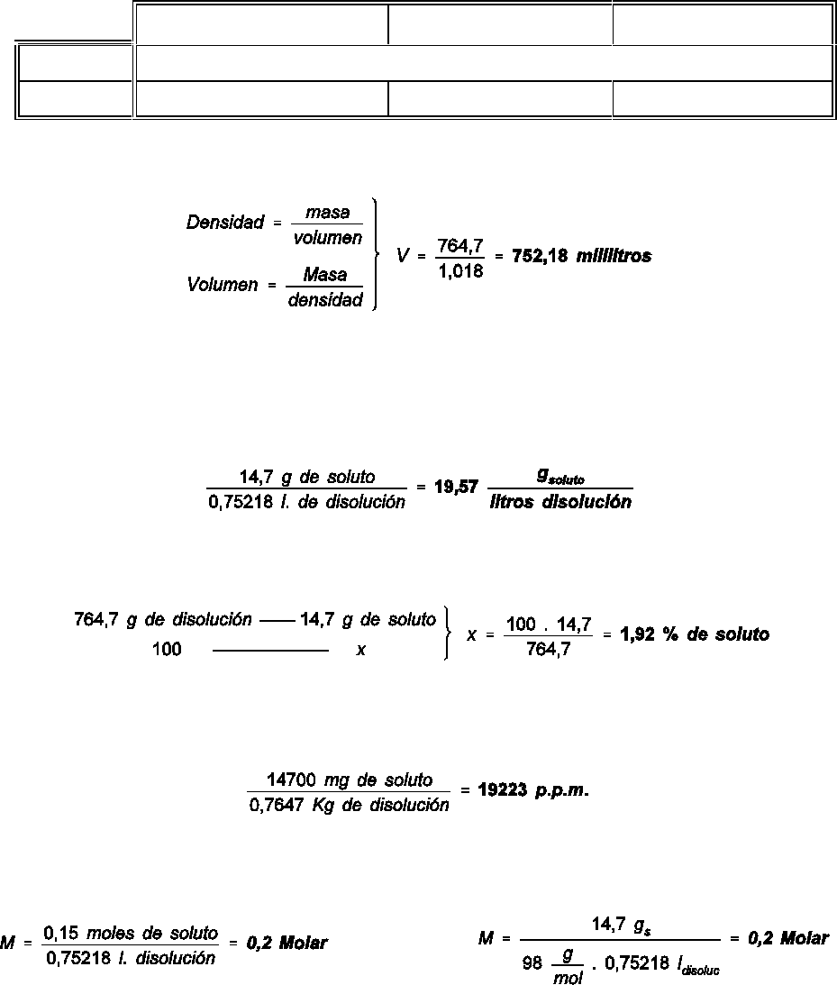 ácido sulfúrico de densidad 1,84 g/mL y del 97% de riqueza. El volumen de la disolución resultante resultó ser
