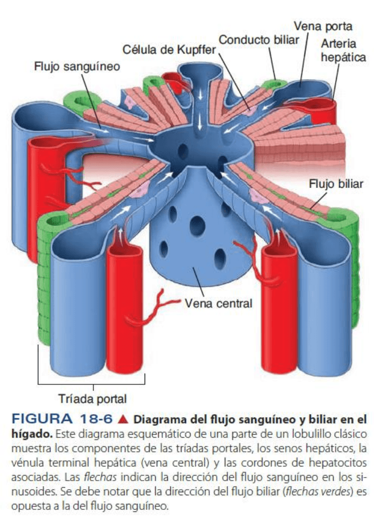 sentido opuesto al flujo sanguíneo). Cerca del espacio portal, pero aun dentro del lubulillo, los canalículos biliares