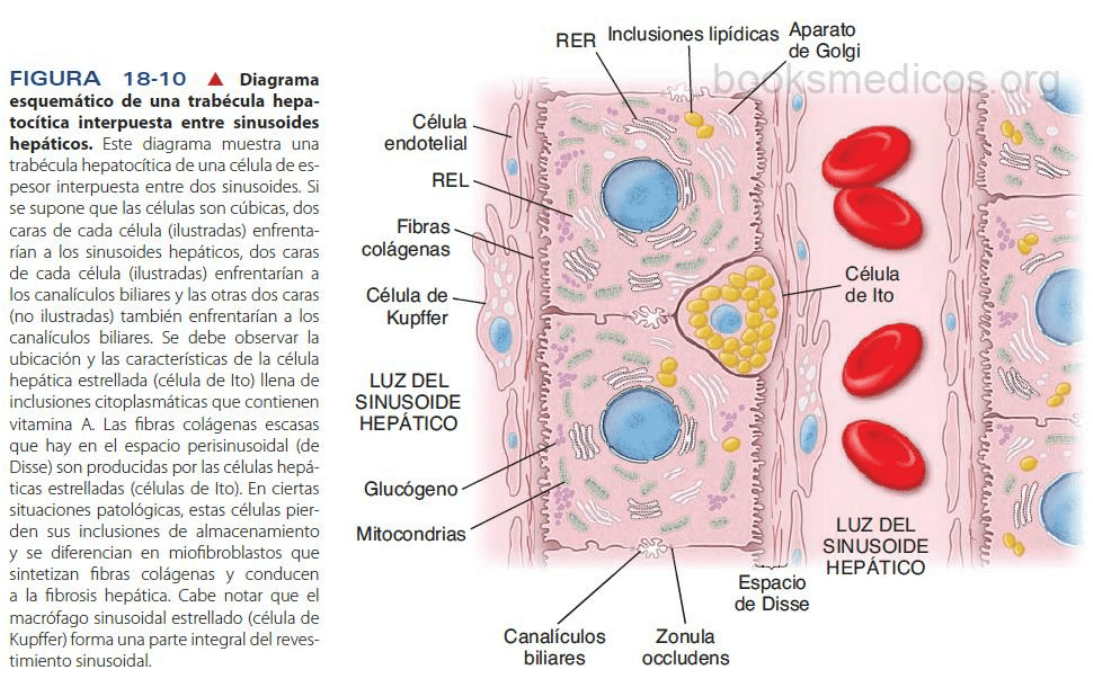 El REL puede ser extenso en los hepatocitos. El REL contiene enzimas que intervienen en la degradación y la