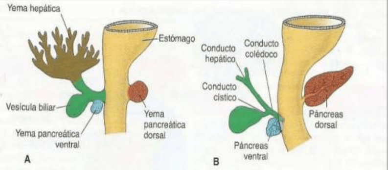 primero surgen hígado, conductos hepáticos y colédoco. Del segundo la vesicula y el conducto cístico.