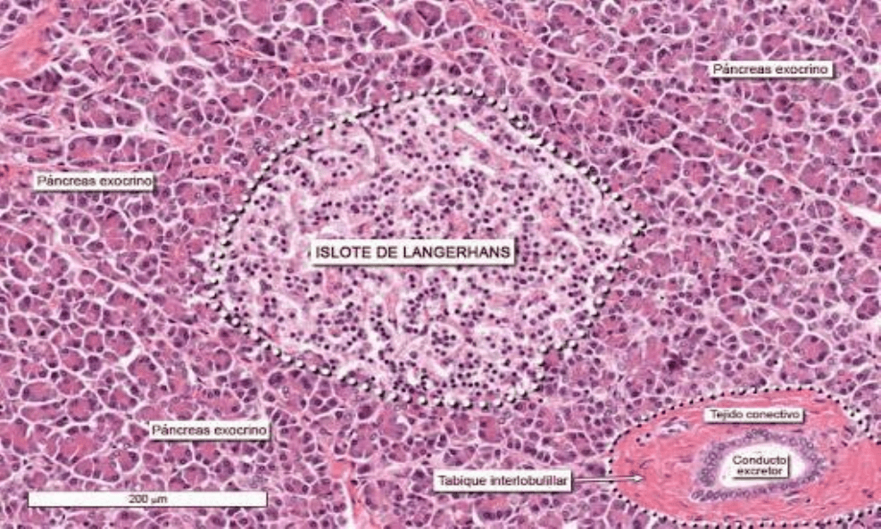como cúmulos de células pálidas rodeados por acinos pancreáticos que se tiñen con mas